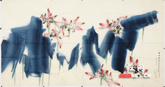说起这幅新作的创作过程,湖南美术出版社社长告诉我们,“黄老为了这幅作品,一共画了三次。”社长回忆说,第一次画的是荷花,画完后黄老觉得背景不够透明,丢掉了;第二次画了一匹骏马,因为中途来了客人,终止了运笔,黄老还是不满意;第三次是黄老挑了一个安静的上午终于完成了。画完后,黄老在画上庄重题下“日出东海上,月照洞庭波——湖南美术出版社惠存,黄永玉九十作于甲午”。
