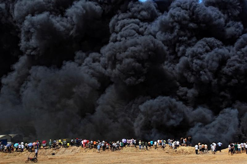 2013年7月2日,长沙浏阳河黄兴大桥附近,两个复合地板仓库起火,火势借着风势蔓延,冒出的滚滚黑烟,几乎全城都看得到。华剑回忆,当天他刚好从浏阳出差回来,经过高速收费站时看到远处浓烟漫天。凭着职业敏感,他第一时间赶到现场,拍下了这张图片。