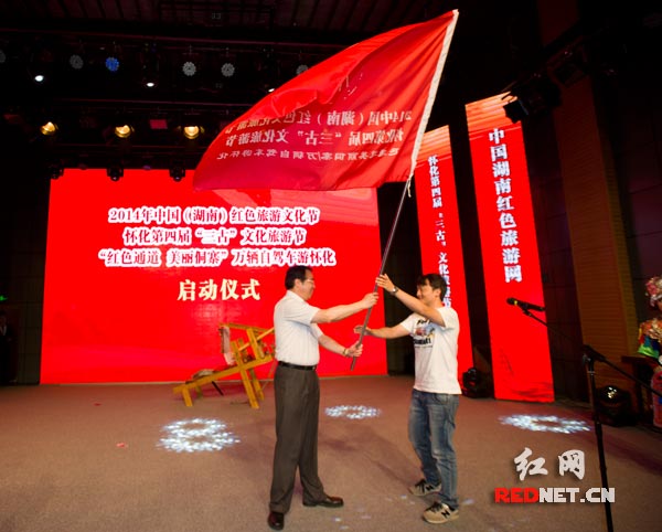 湖南省委常委、省委宣传部部长许又声[左]为“红色通道 美丽侗寨”万辆自驾车游怀化活动授旗。