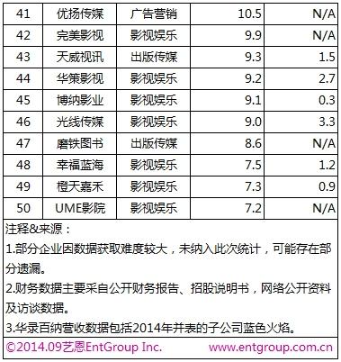 2013-2014年度中国文娱企业50强榜单出炉 万达文化位居榜首,中南传媒紧随其后,位居第二