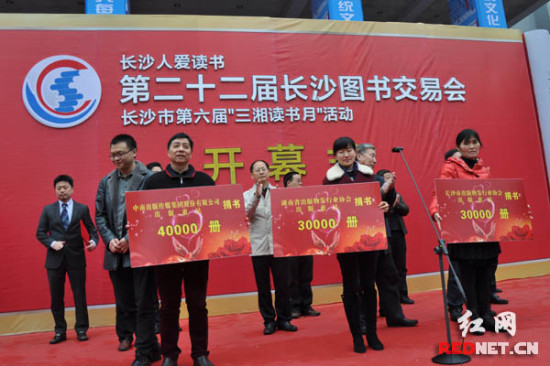 开幕仪式上,中南传媒集团股份有限公司、湖南省出版物发行业协会、长沙市出版物发行业协会向长沙市图书馆总分馆、14家首批示范性农家书屋和获得全国“书香之家”称号的书香家庭,捐赠了10万册图书。2014年度长沙人最喜爱的10本书也同时揭晓,其中,《习近平谈治国理政》、王跃文所著的《爱历元年》等书成功入选。